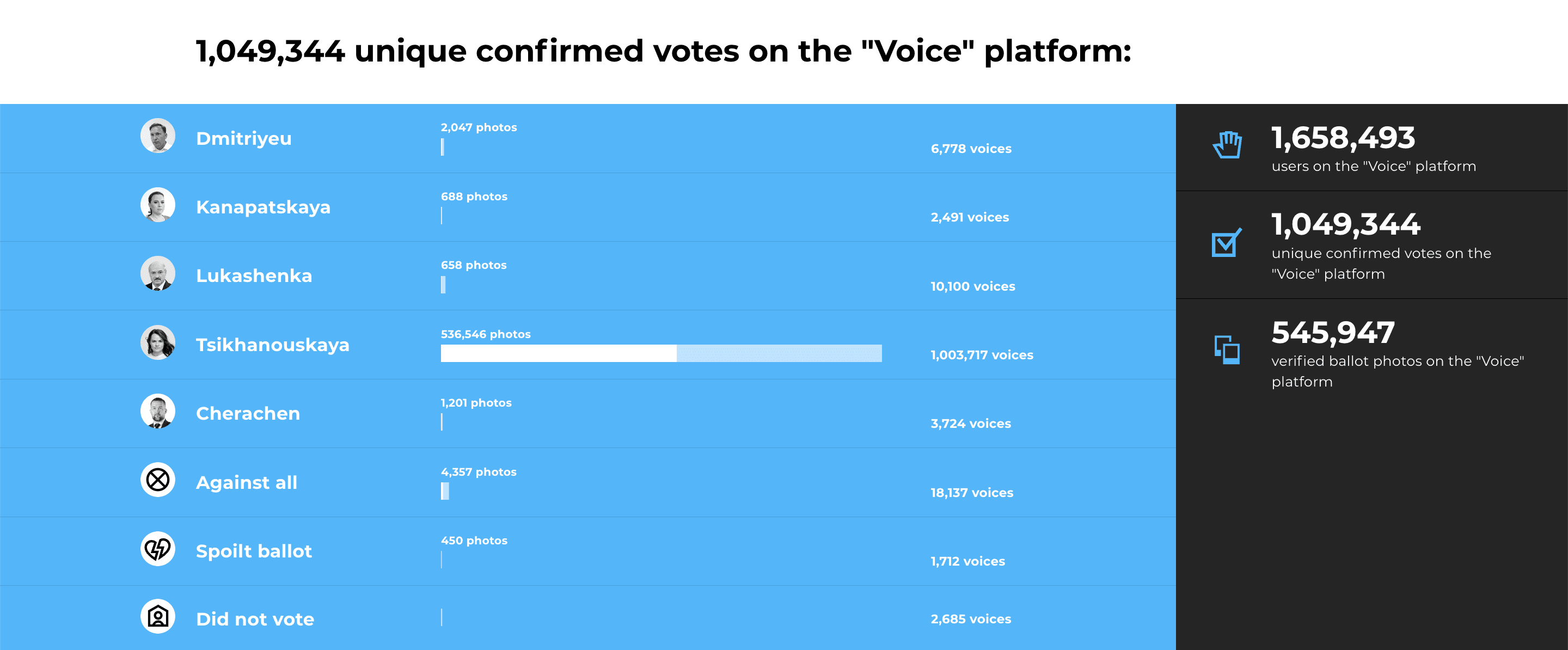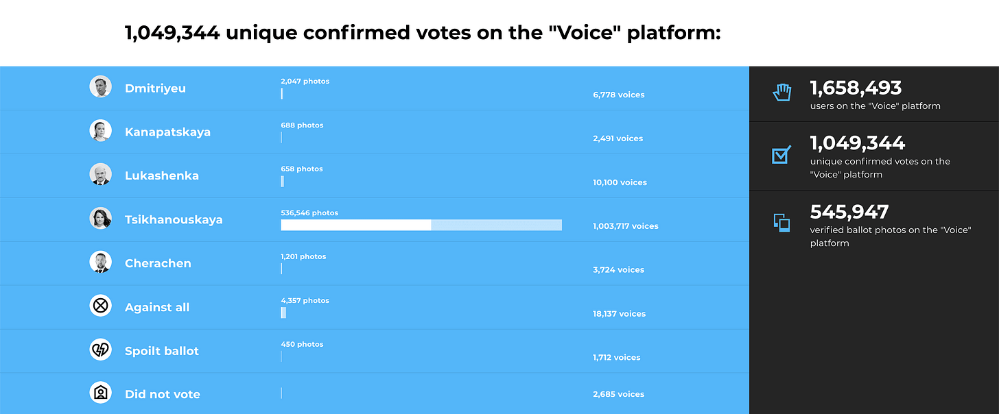 Results of 1 million confirmed votes on the "Voice" platform, demonstrating election fraud. Detailed reports with protocols for each polling station are available on the platform – https://belarus2020.org/election