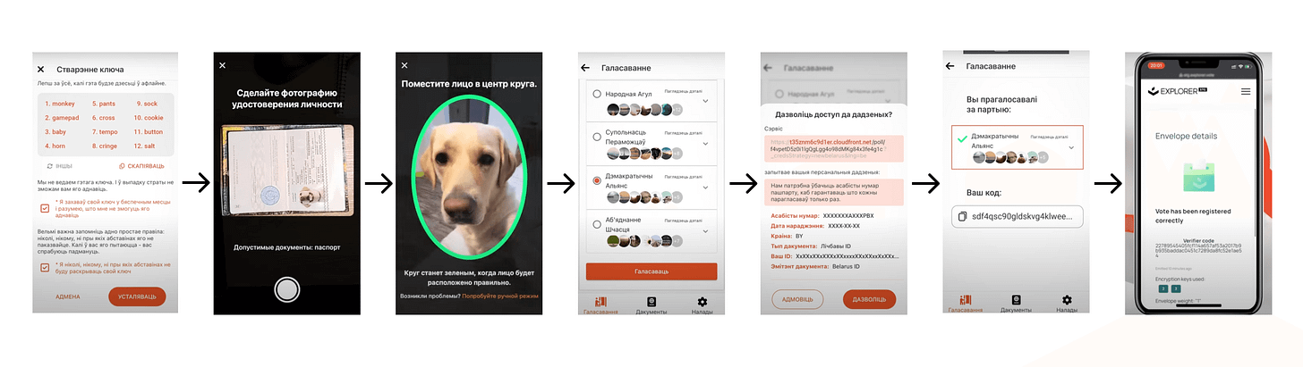 Screenshot showing the entire process a user must go through to vote, ensuring security and anonymity at each step.