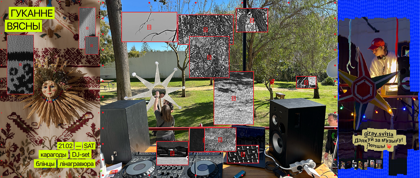 saturday evening i played a DJ set at “Гуканне вясны” — a Belarusian spring-calling ritual, but in Lisbon. we moved to rhythms that predate the concept of borders. the AI didn't know. i didn't plan it. same day, different rituals, same frequency.